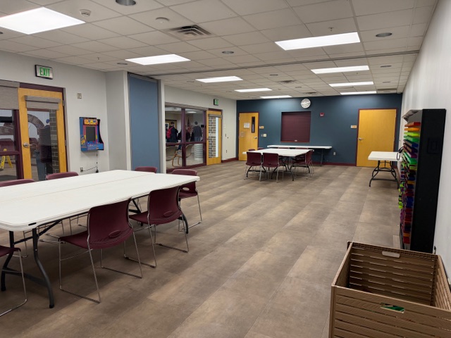 This area functions as an informal meeting spot, offering comfortable seating and a coffee corner with fresh coffee available during all open hours. Tables throughout the lobby provide a place for children to enjoy their lunches or free meals, and for families to pause and connect.