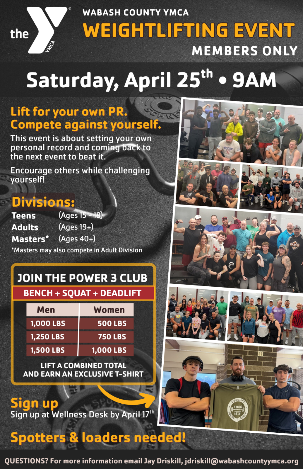 Join fellow Wabash County YMCA lifters as we challenge ourselves, encourage one another, and set new personal records. This members-only event takes place twice each year - spring and fall - and features the three classic power lifts: Bench Press, Squat, and Deadlift