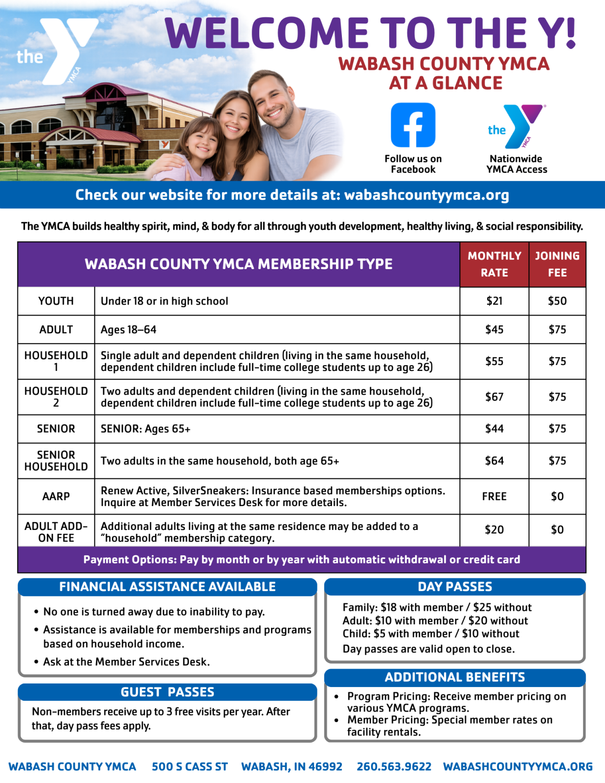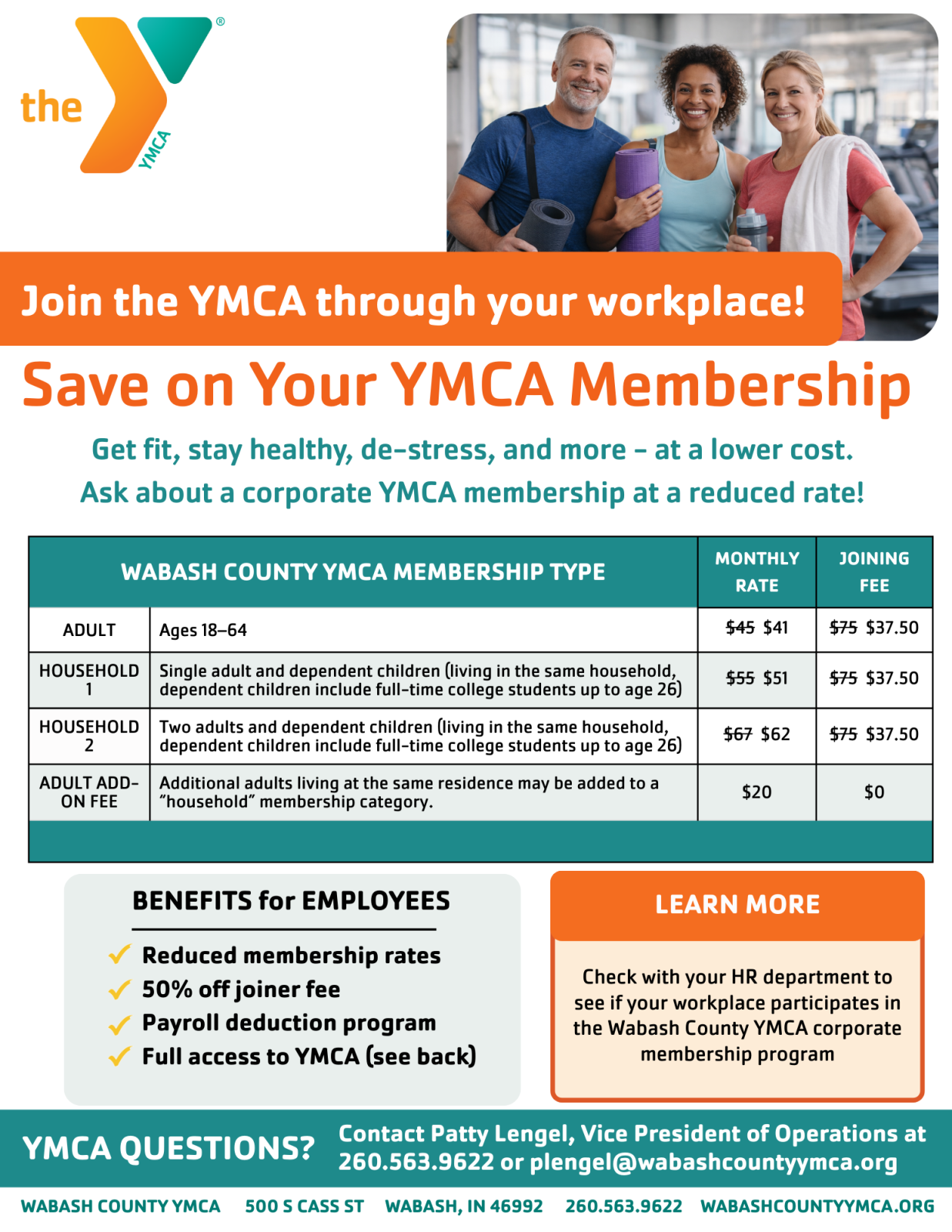 Join the Wabash County YMCA and become part of a welcoming community focused on wellness, connection, and personal growth. Membership gives you full access to our facility, programs, and support for individuals and families.
