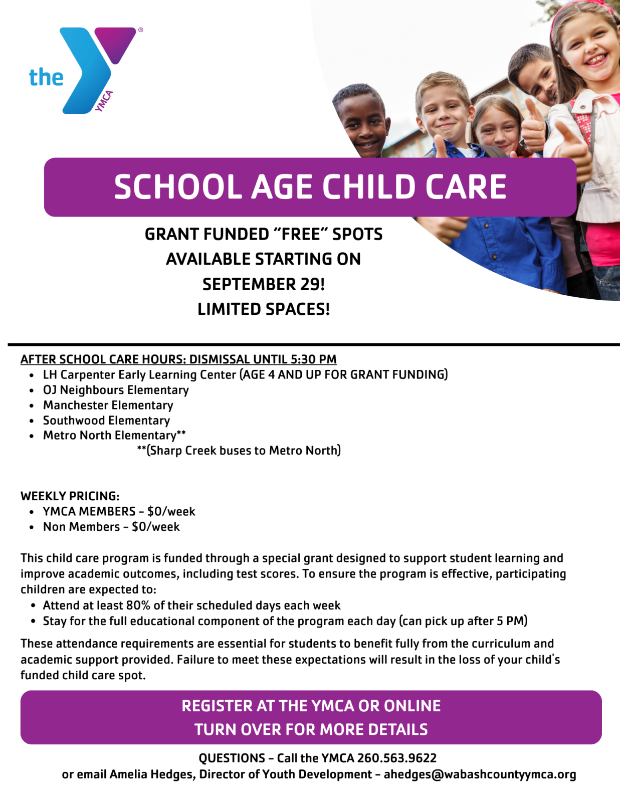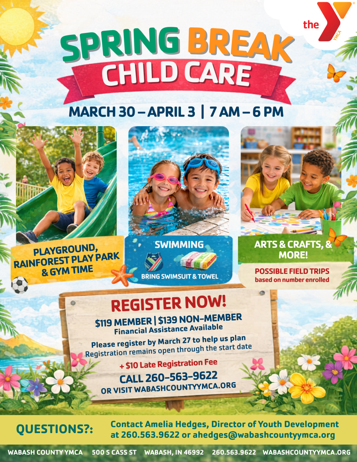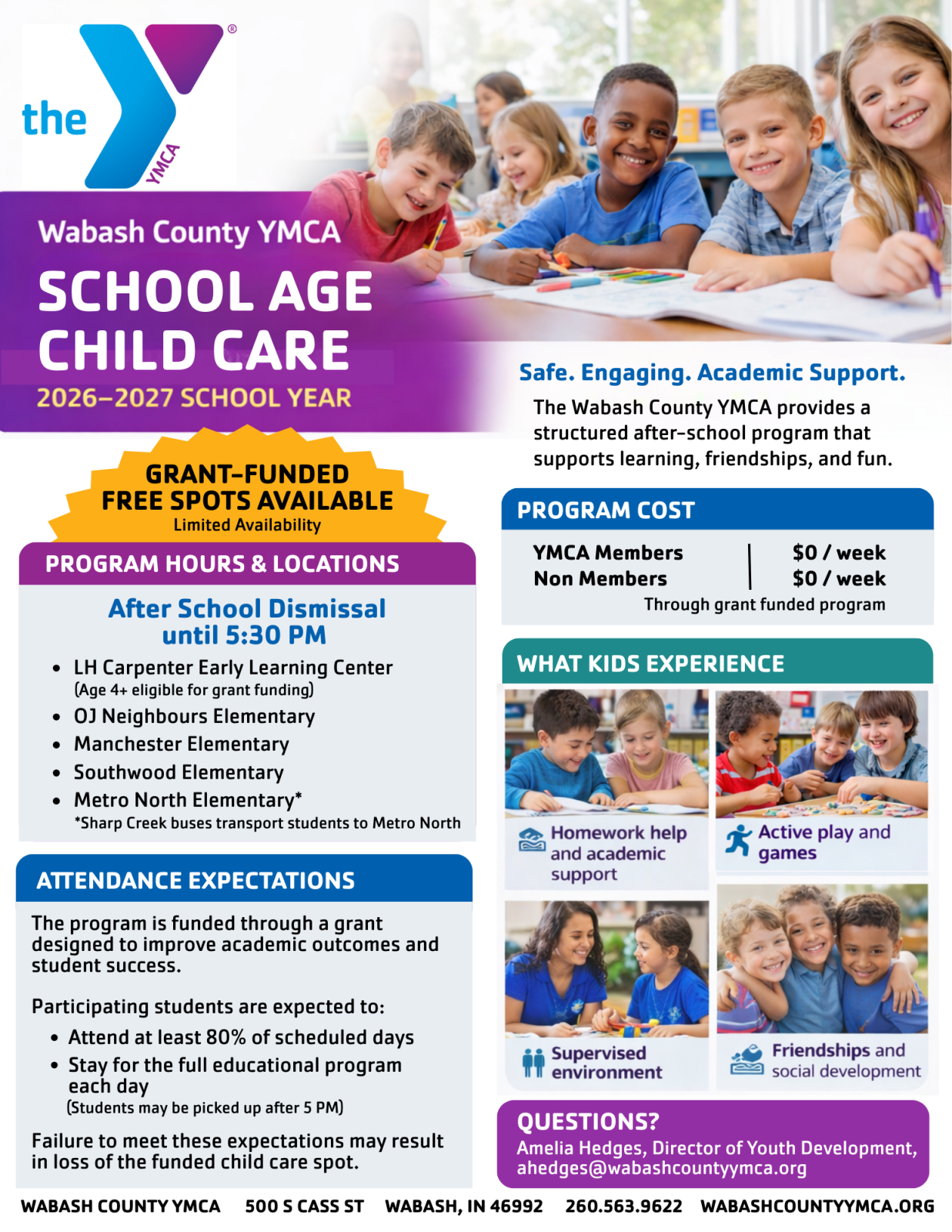 For more information, contact Sarah Law, Youth Development Coordinator | 260.563.9622 | slaw@wabashcountyymca.org